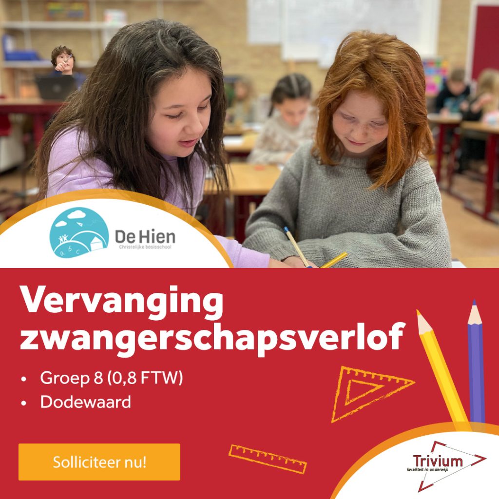 Op Chr. basisschool De Hien zoeken wij met ingang van 23 maart 2026 een enthousiaste collega voor 0.8fte in groep 8!