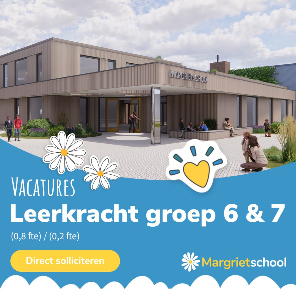 De Margrietschool in Wageningen is per 1 februari ’26 (of eerder) op zoek naar een enthousiaste leerkracht voor groep 6 (0.8 fte) en groep 7 (0,2 fte)